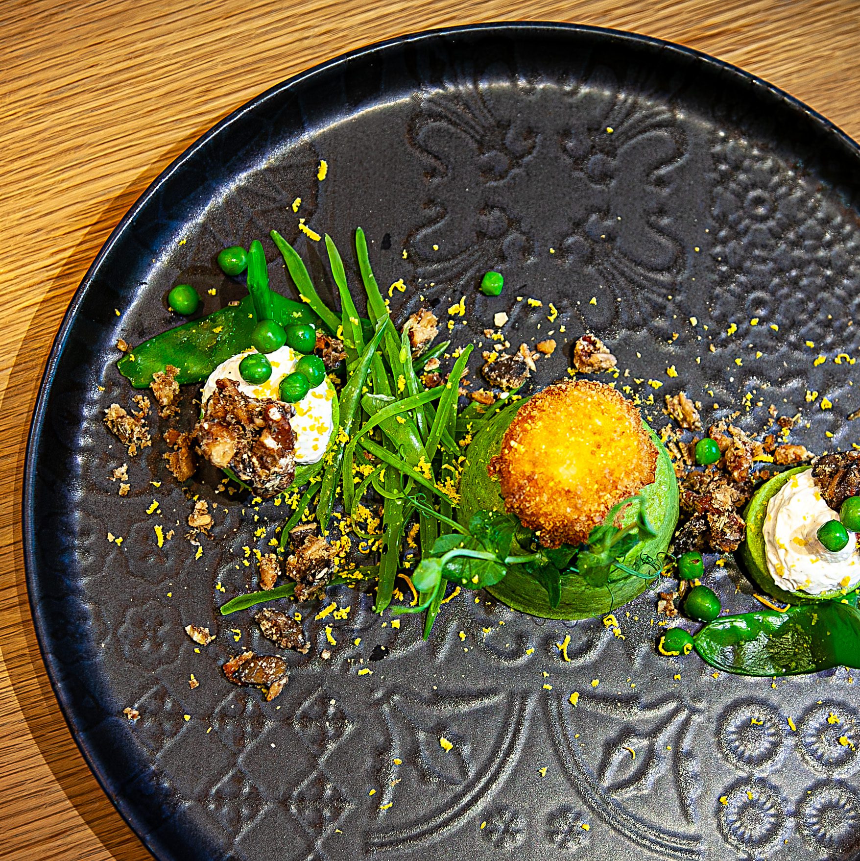Pea Flan I Snow Peas I Nut Granola I baked Egg I Garden Cress I Lemon Espuma