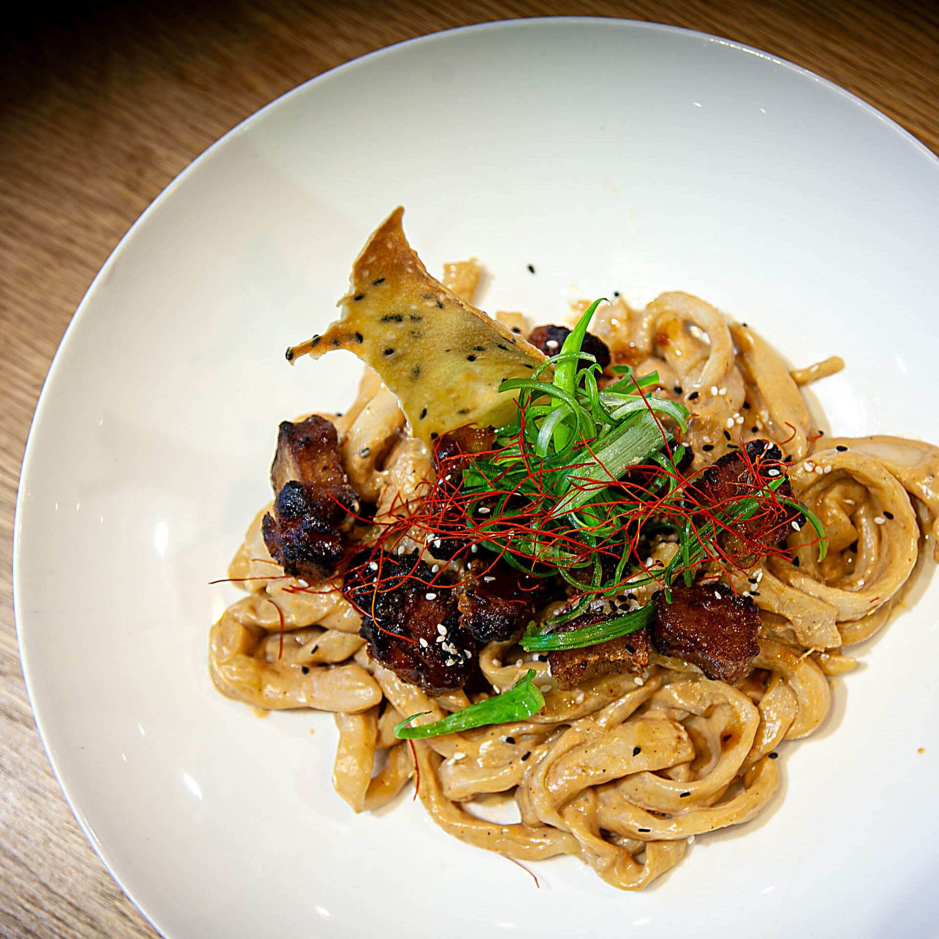 Homemade Udon Noodles I Peanut Sauce I Spring Onion I crispy Tofu I Sesame Cracker I Vegan
