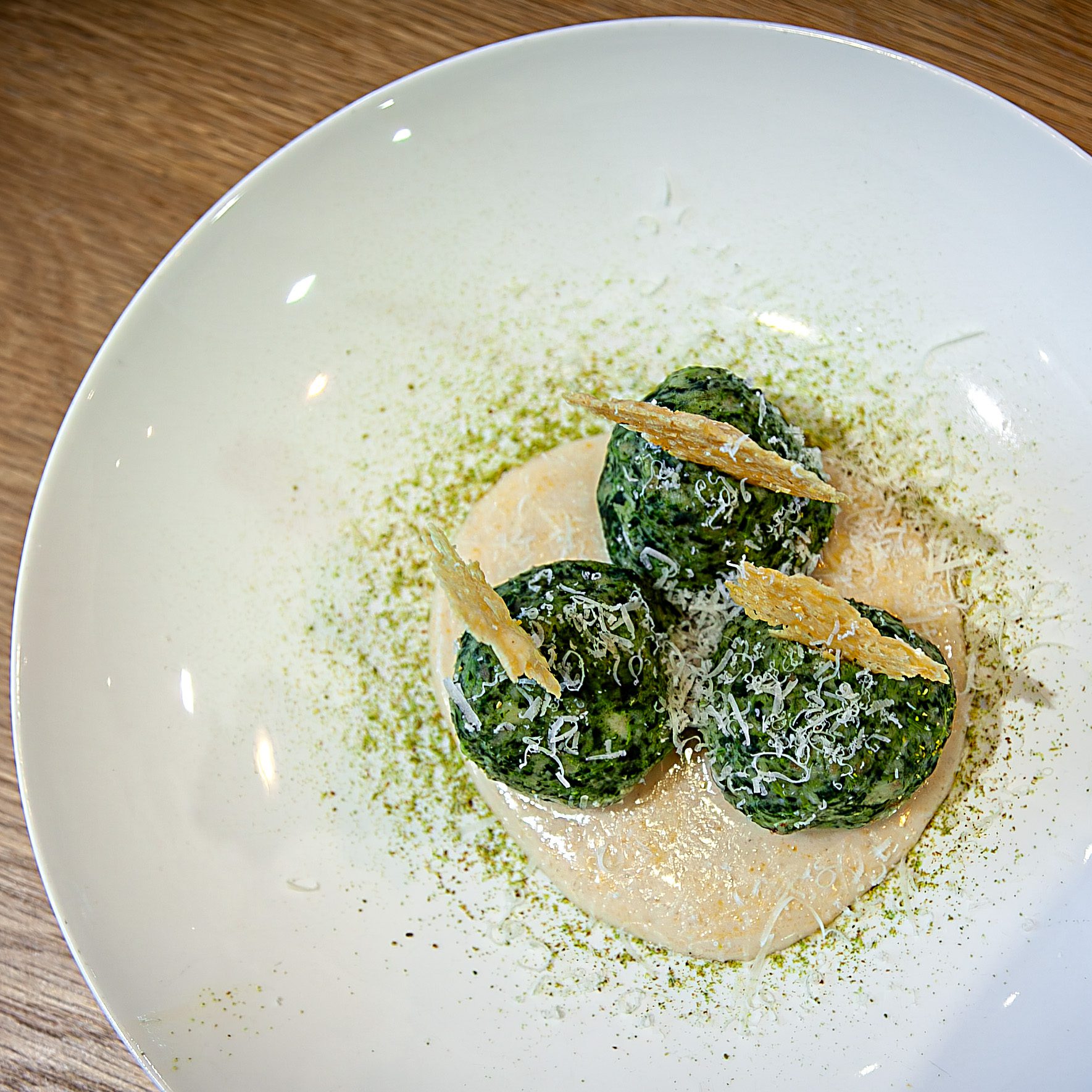 Spinach–Ricotta Dumplings I Beurre Blanc I Parmesan Chips I Chili Oil