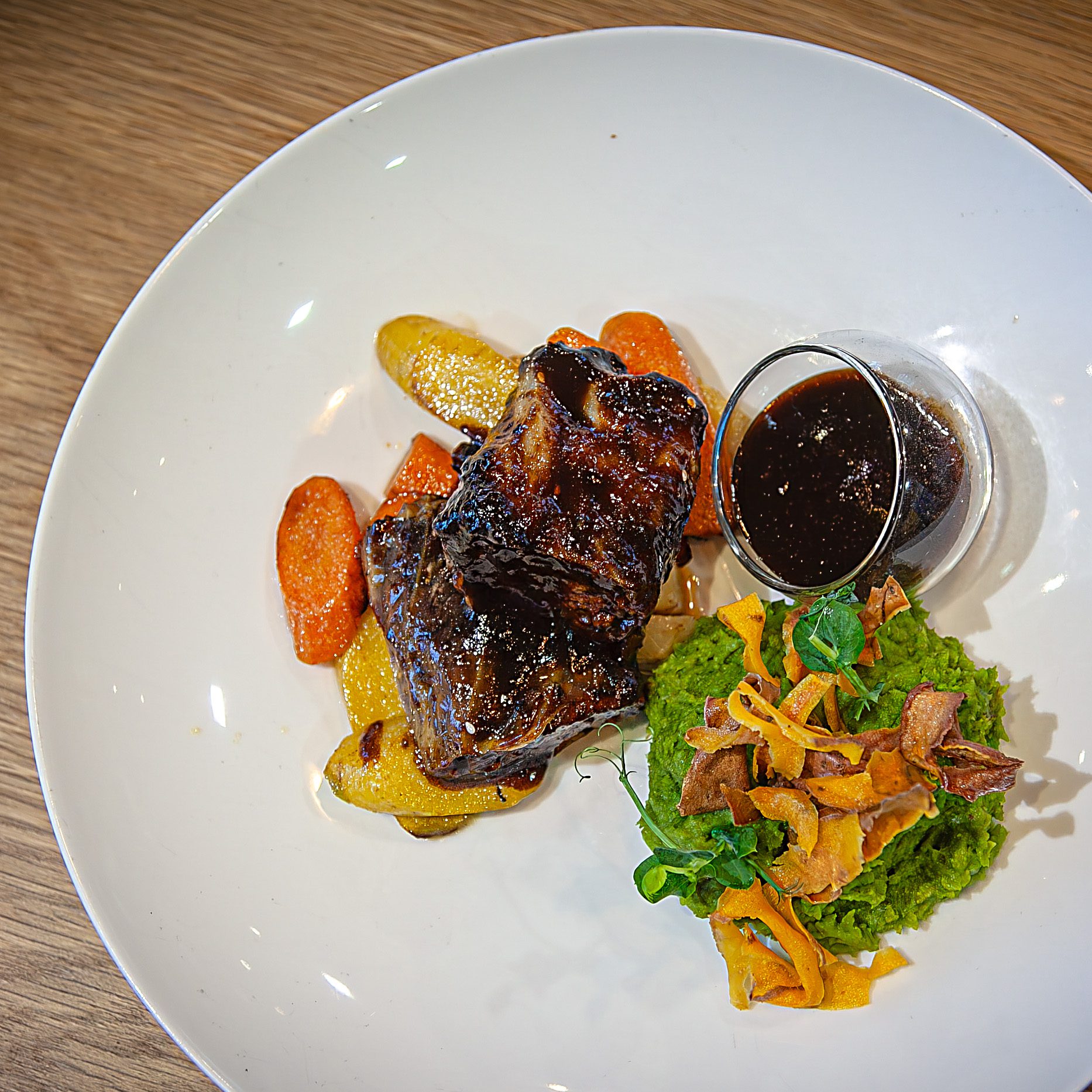 Geschmorte Rinderbacke I Selleriepüree I Babykarotten I Schnittlauch Öl I Röstzwiebel I JusA.G.O.M€ 32,90